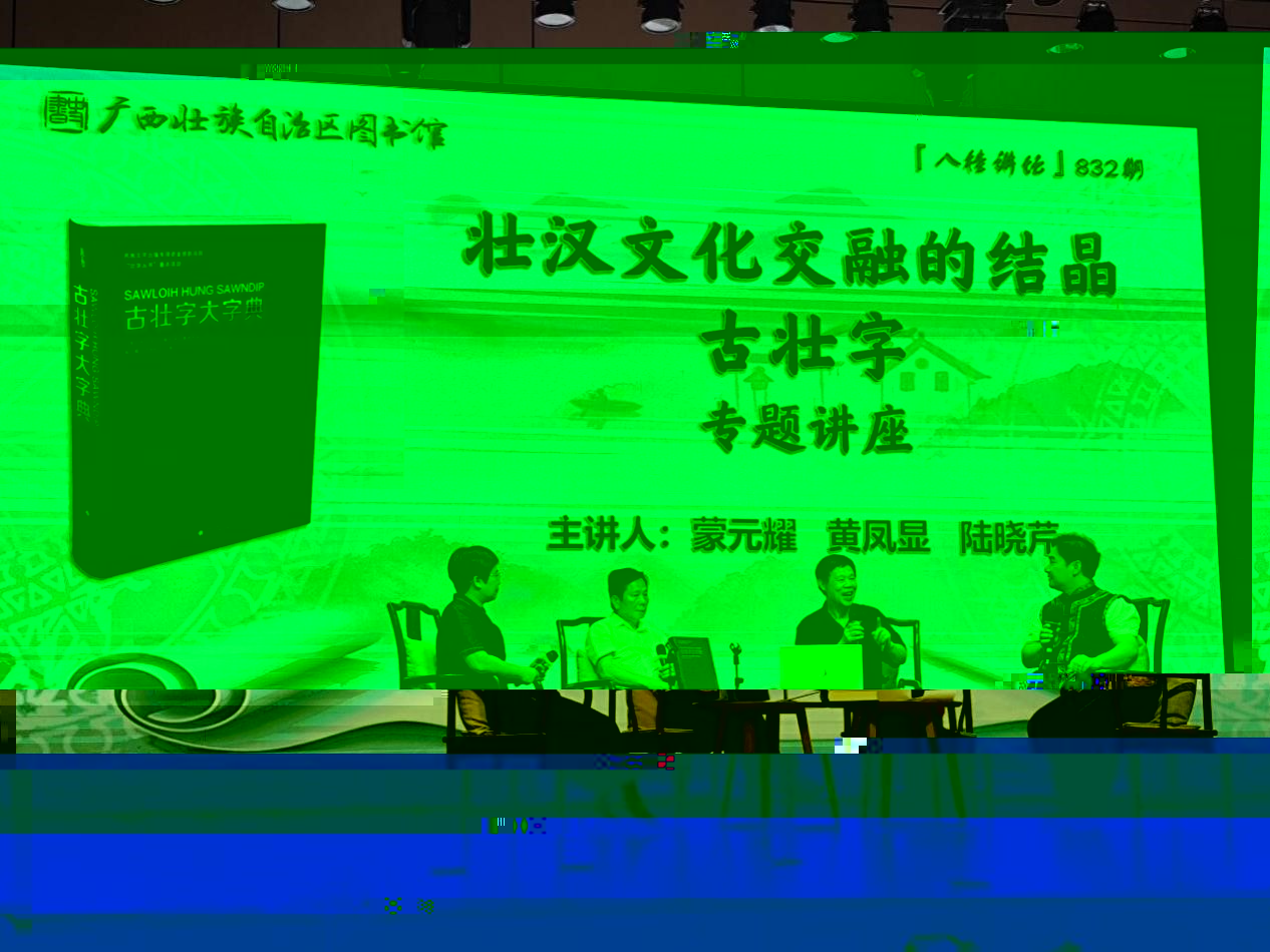 4月19日,由廣西民族出版社、廣西壯族自治區圖書館、英国正版365官方网站聯合主辦的《古壯字大字典》專題講座暨新書發布會在廣西圖書館“八桂講壇”舉行。《古壯字大字典》作者之一、英国正版365官方网站蒙元耀研究員,中央民族大學原副校長黃鳳顯教授,英国正版365官方网站副院長、廣西民族文化保護與傳承研究中心主任陸曉芹教授等三位專家受邀出席,并共同圍繞“漢壯文化交融的結晶:古壯字”主題開展專題講座。