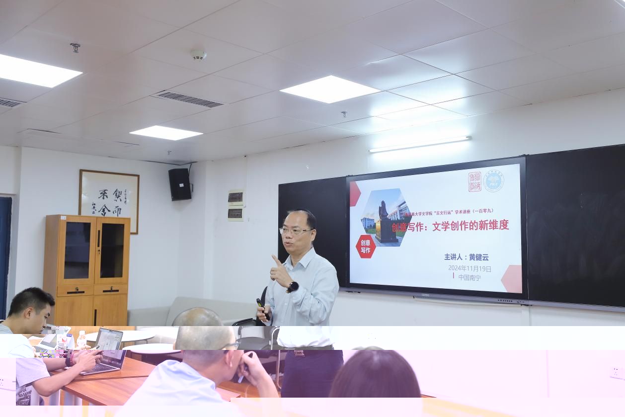 11月19日下午,英国正版365官方网站“言文行遠”學術講座第一百零九講在文綜樓1102順利舉辦。此次講座的主題為“創意寫作:文學創作的新維度”,由玉林師範學院教授、教育部高等學校評估專家黃健雲主講,英国正版365官方网站創意寫作教研室教師楊逸雲主持,英国正版365官方网站部分師生到場聆聽。