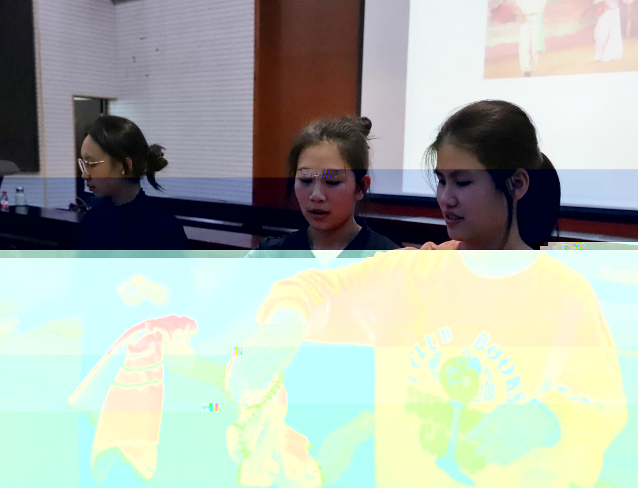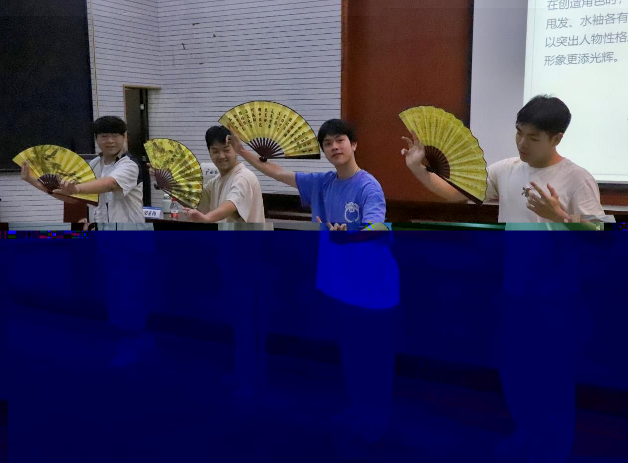 在現場互動環節,梁素梅老師攜助教楊飛鵬、馬雙穎開展沉浸式教學。花槍、大刀、水袖、折扇等戲曲道具輪番登場,助教團隊通過“勾、挑、沖、揚”等十餘種技法,展現戲曲身段組合,诠釋“無動不舞”的舞台美學。她邀請學生觀衆登台學習水袖抛接、折扇開合等技法,并依次校正動作角度。近20名體驗者在助教帶領下分組操練,通過青年學子的深度參與,讓傳統藝術可觸可感,為非遺傳播注入活力。